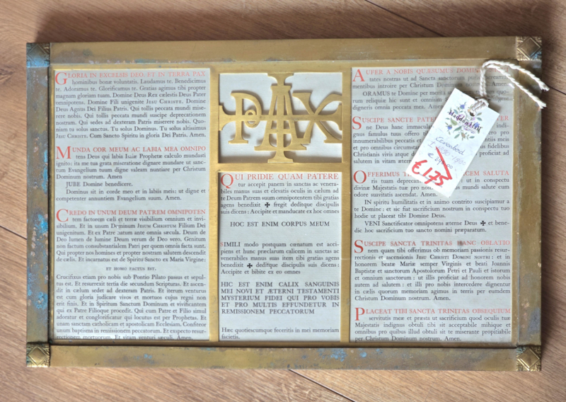 Dit canonbord is gemaakt rond 1890. Het heeft Latijnse gebeden en een gouden PAX-symbool in het midden. Het bord is ingelijst en heeft een vintage uitstraling. Het is een mooi stuk voor verzamelaars van religieuze objecten.