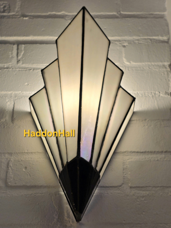Fabuleuze Tiffany wandlamp in typische Art Deco waaiervorm. Deze glamoureuze Art Deco stijl is ontstaan in Parijs en wordt daarom ook wel French Art Deco genoemd. Het paarlemoer glas past prachtig bij het feestelijke ontwerp. Het zwarte armatuur zorgt voor een fraai contrast.