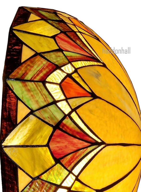 Monumentale tafellamp met koepelvormige kap. Het spetterende Tiffany model is gemaakt van glas in warme tinten rood, geel en oranje. Vele kleurnuances zijn te ontdekken in het ornamentele kunstwerk. De "bewegende" elegante voet refereert naar een dans en harmonieert fantastisch met de Blossom.